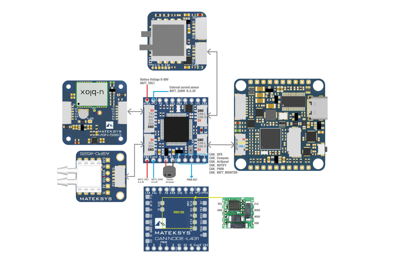 | Інтерфейс | CAN , DroneCAN , I2C , PWM , SPI , UART |