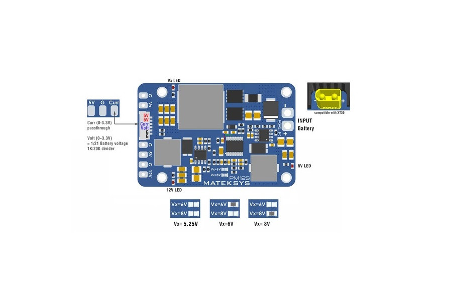 Пристрій оснащений одразу трьома незалежними стабілізаторами BEC: універсальним xV, вихід якого можна налаштувати під потреби системи, а також фіксованими 5V та 12V. Така конфігурація дозволяє одночасно живити камери, відеопередавачі, LED-системи, автопілот, телеметрію та інше обладнання без ризику перевантаження або просідання напруги.