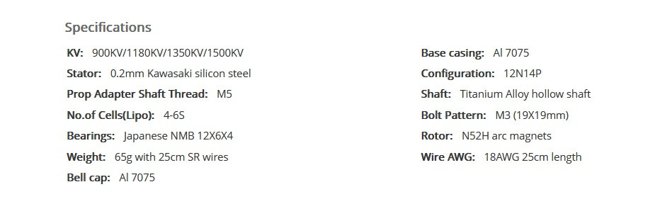 Его конструкция включает в себя премиальные магниты N52H, японские подшипники NSK, анодированный алюминиевый корпус и прочную ось. Это гарантирует долговечность и стойкость к экстремальным условиям. Мотор превосходно сочетается с 7–9" пропеллерами и 6S батареями, обеспечивая спокойный контроль и высокую эффективность при тяжелых нагрузках.